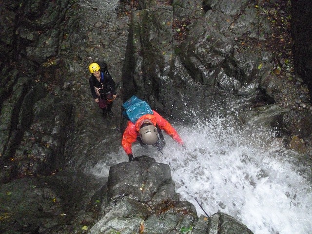 全ての滝はザイルを装着して直登を目指し、そして何よりも安全に登り終えることを目標と致しました。その中で1年生に沢登りの楽しさを感じ取って貰いたいと。当日の朝、秦野駅に全員遅刻なく集合。タクシーにて葛葉の泉まで一気に入ってしまう。準備体操をして早速行動開始。出だしの小堰堤を巻いてから木漏れ日の中を入渓開始、加藤(1年)、井上(1年)両隊員とも、入部してから今回で沢登りが2回目なので、各滝の通過時のザイルの装着、声の掛け合いなど大分要領を掴んできているようだ。この沢、実は前半のハイライトは板立の滝ではなく、F1(5m)のシャワークライムであります。前回、5月の初めに1年生を連れてきたときは気温が低く、登る気はしなく右側を巻いてしまった。今回は暑い、水量多い、2年の宝迫隊員は気力充実、賀来隊員は暑いので早く滝の中に突っ込みたい、1年生2人も戦闘意欲満々と…・・すべての条件が整いました。大谷が雨具を着こんでトップで登り、賀来君以下順次シャワークライムを満喫して貰う。確保をしていると全員ズブ濡れで登ってくるのだが、落ち口に上がってくるその顔が実に良い。宝迫隊員はこのシャワークライム中に水流を顔面で受け止め、コンタクトがズレて大苦戦。トーマスのように目をクルクルして登ってきた。このF1の通過を含めて前半で少々時間を喰うが、大人数でザイルを出している為止むを得ないとする。林道がクロスする大平橋以降は大分水量も落ち着き、滝も小ぶりになるので、各滝については面白いルート取りをして登る。賀来隊員はあまりの暑さに、滝を登る際にあえて水流沿いに登り始める。暑さで濡れても丁度いい感じである。F9(6m)を越え、小ゴルジュ帯を通過してから、直に左の尾根道へ取り付き明瞭な踏み跡を辿り、三の塔尾根へ抜けきる。尾根の登山道に出てから、ガチャものを格納して三の塔へ再び登り始める。15分で頂上に出て記念写真を撮るが、とにかくメチャクチャに暑い。富士山も時折雲から顔を出し、箱根の山、伊豆半島、大山、都内、塔の岳、丹沢山まで眺望を満喫できた。二の塔尾根経由で入渓地点の葛葉の泉まで一気に下山する。着替えをしてから、菩提のバス停まで暑いアスファルトの道を歩き、 バスで秦野駅に着いて解散とする。1年生の加藤君、井上君ご苦労様でした。賀来隊員もリードを頑張りました。また、村木OBもお忙しい中、参加して頂き本当に有難うございました。何と7月7日は川の日でした。