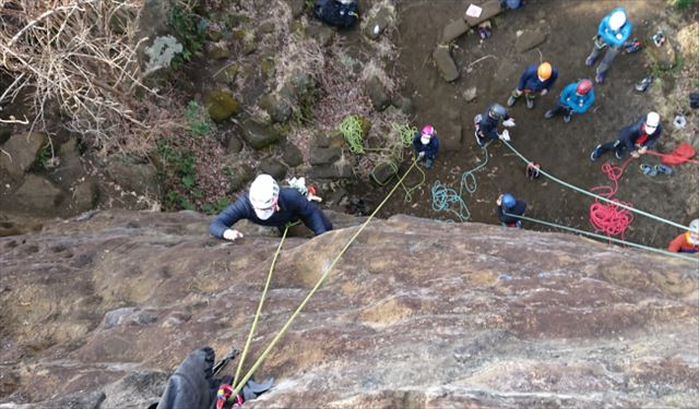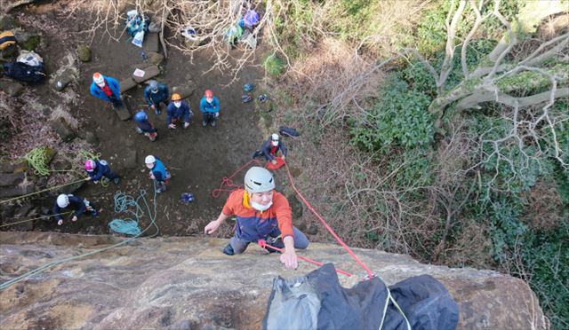 2時間半ほど登った後、もう一本ロープを垂らし懸垂下降の練習を行う。初めての外岩でのロープワー