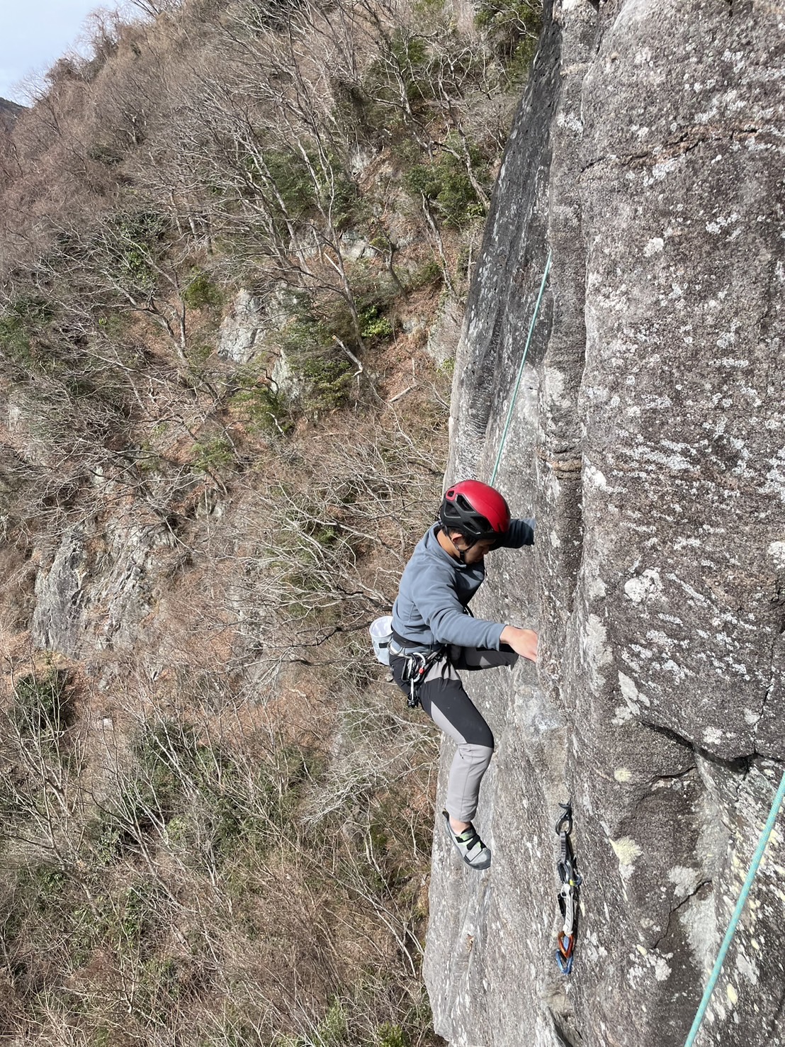 ルートの初めの方は岩棚に乗りそこからクラックが続いていく。中盤はハンドジャムを決めていきながら登り、終盤は左へトラバースしていく。村上コーチがカムとナッツの入れる場所や入れ方、登っていく最中に気を付ける事などを教えてくださった。そして登攀を始める。村上コーチにリードをしてもらい、加藤がビレイをする、トップロープであれば尾崎にもビレイをして貰うという形で登って行った。