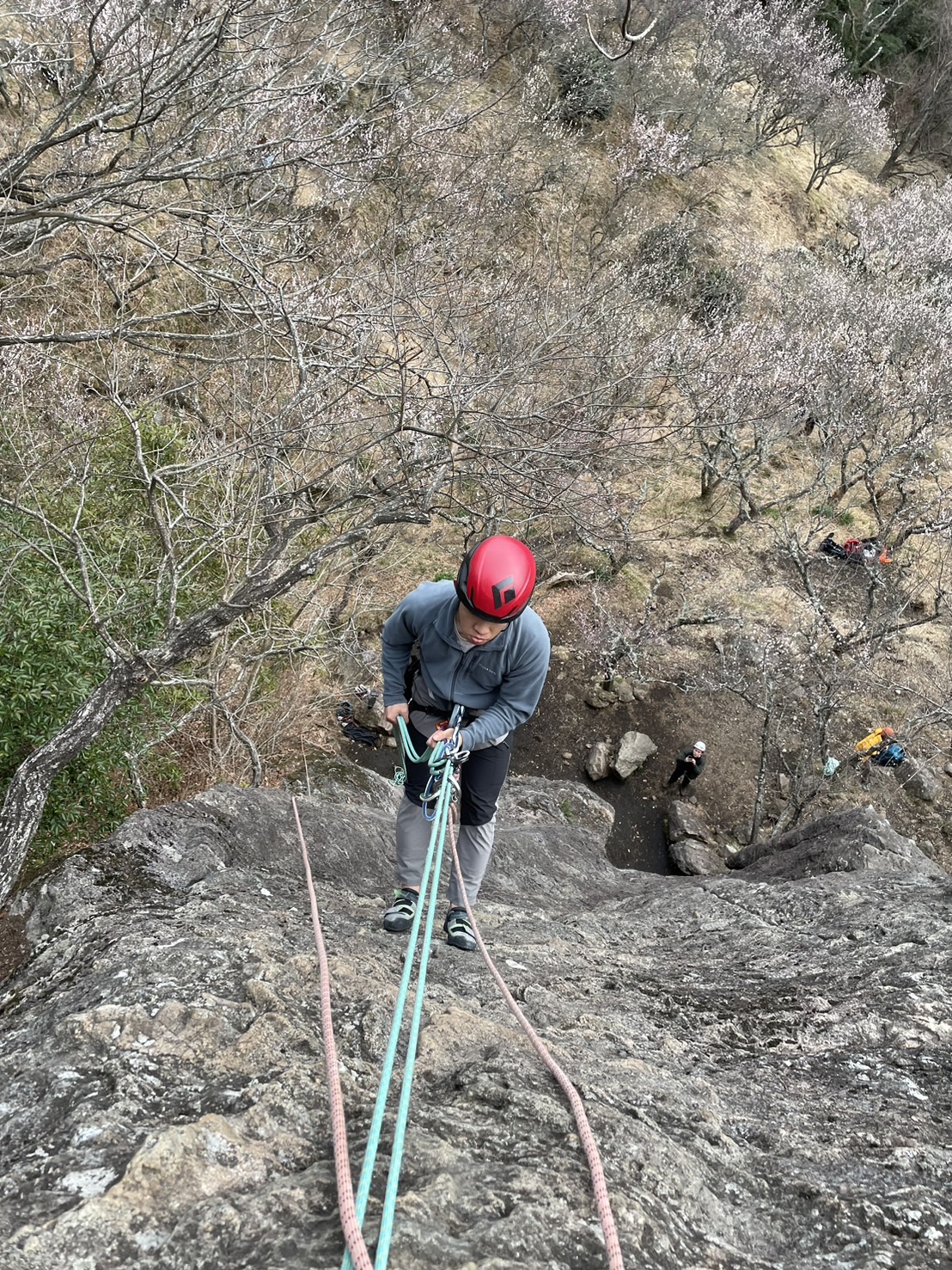 終盤のトラバースは下方向に掴むホールドはないが足場はあるので体を上げさえすれば横移動ができる。何回もテンションを張って貰い二人とも登りきることができた。本来ならここで懸垂下降訓練もしたかったが、加藤が持ってくるロープの長さを間違えたせいで二つ目のロープを張ることが出来なかったので、ロープを回収して懸垂下降がやりやすい桃源郷に13:20移動。桃源郷では蟻さんルートを登った。難易度は5.8でクラックはなく、傾斜が緩い代わりに掴む場所や足を置く場所がわかりづらかった。そして同ルートにて懸垂下降の訓練に移る。尾崎は初めての高所での懸垂下降だったのでかなり時間がかかってしまった。二回ほど懸垂下降の訓練をして今回のクライミングを終了した。