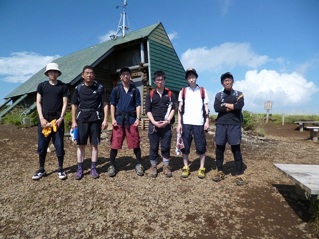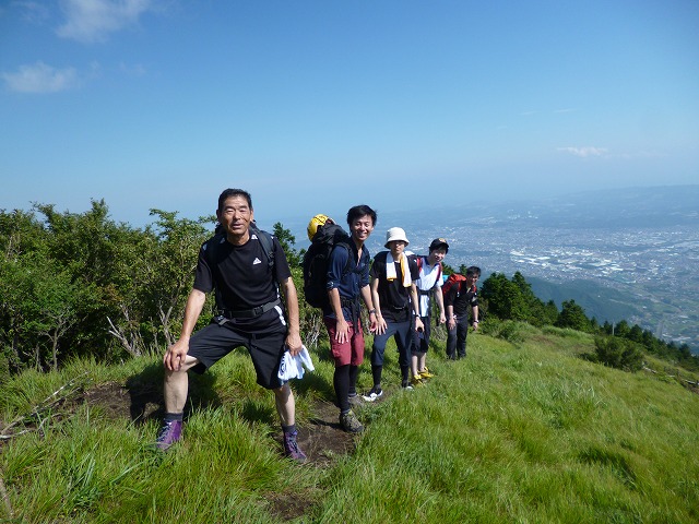 全ての滝はザイルを装着して直登を目指し、そして何よりも安全に登り終えることを目標と致しました。その中で1年生に沢登りの楽しさを感じ取って貰いたいと。当日の朝、秦野駅に全員遅刻なく集合。タクシーにて葛葉の泉まで一気に入ってしまう。準備体操をして早速行動開始。出だしの小堰堤を巻いてから木漏れ日の中を入渓開始、加藤(1年)、井上(1年)両隊員とも、入部してから今回で沢登りが2回目なので、各滝の通過時のザイルの装着、声の掛け合いなど大分要領を掴んできているようだ。この沢、実は前半のハイライトは板立の滝ではなく、F1(5m)のシャワークライムであります。前回、5月の初めに1年生を連れてきたときは気温が低く、登る気はしなく右側を巻いてしまった。今回は暑い、水量多い、2年の宝迫隊員は気力充実、賀来隊員は暑いので早く滝の中に突っ込みたい、1年生2人も戦闘意欲満々と…・・すべての条件が整いました。大谷が雨具を着こんでトップで登り、賀来君以下順次シャワークライムを満喫して貰う。確保をしていると全員ズブ濡れで登ってくるのだが、落ち口に上がってくるその顔が実に良い。宝迫隊員はこのシャワークライム中に水流を顔面で受け止め、コンタクトがズレて大苦戦。トーマスのように目をクルクルして登ってきた。このF1の通過を含めて前半で少々時間を喰うが、大人数でザイルを出している為止むを得ないとする。林道がクロスする大平橋以降は大分水量も落ち着き、滝も小ぶりになるので、各滝については面白いルート取りをして登る。賀来隊員はあまりの暑さに、滝を登る際にあえて水流沿いに登り始める。暑さで濡れても丁度いい感じである。F9(6m)を越え、小ゴルジュ帯を通過してから、直に左の尾根道へ取り付き明瞭な踏み跡を辿り、三の塔尾根へ抜けきる。尾根の登山道に出てから、ガチャものを格納して三の塔へ再び登り始める。15分で頂上に出て記念写真を撮るが、とにかくメチャクチャに暑い。富士山も時折雲から顔を出し、箱根の山、伊豆半島、大山、都内、塔の岳、丹沢山まで眺望を満喫できた。二の塔尾根経由で入渓地点の葛葉の泉まで一気に下山する。着替えをしてから、菩提のバス停まで暑いアスファルトの道を歩き、 バスで秦野駅に着いて解散とする。1年生の加藤君、井上君ご苦労様でした。賀来隊員もリードを頑張りました。また、村木OBもお忙しい中、参加して頂き本当に有難うございました。何と7月7日は川の日でした。